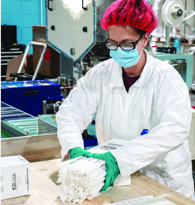 A worker at the Boss Straw factory in Woodstock prepares some paper straws.
