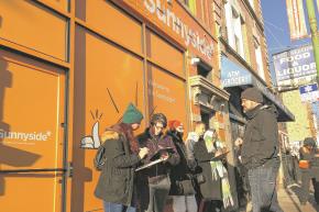 Customers wait outside Sunnyside, a Cresco pot dispensary in Wrigleyville.